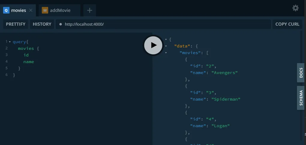 GraqhQL 서버를 열고 쿼리를 작성할 때는 아래와 같이 사용한다.