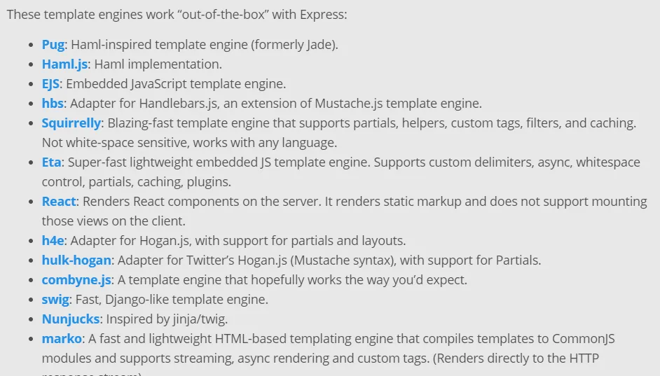 Express 사이트에서 Express가 지원하는 다양한 뷰엔진들을 확인할 수 있는데 이번에는 Nunjucks를 사용해 프로젝트를 진행한다.
