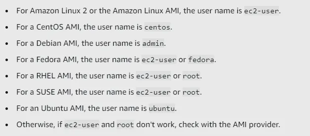 default 인스턴스 유저 이름은 인스턴스를 생성할 때 아래와 같이 생성된다. 생성했던 os에 따라 입력하면 된다.