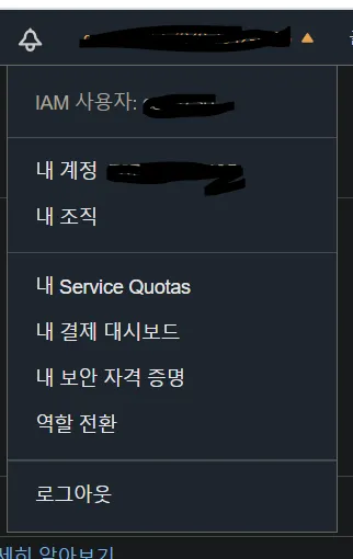 우측 상단의 계정을 클릭하면 ‘내 보안 자격 증명’ 이라는 메뉴가 보인다. 클릭시 IAM 화면으로 넘어온다.