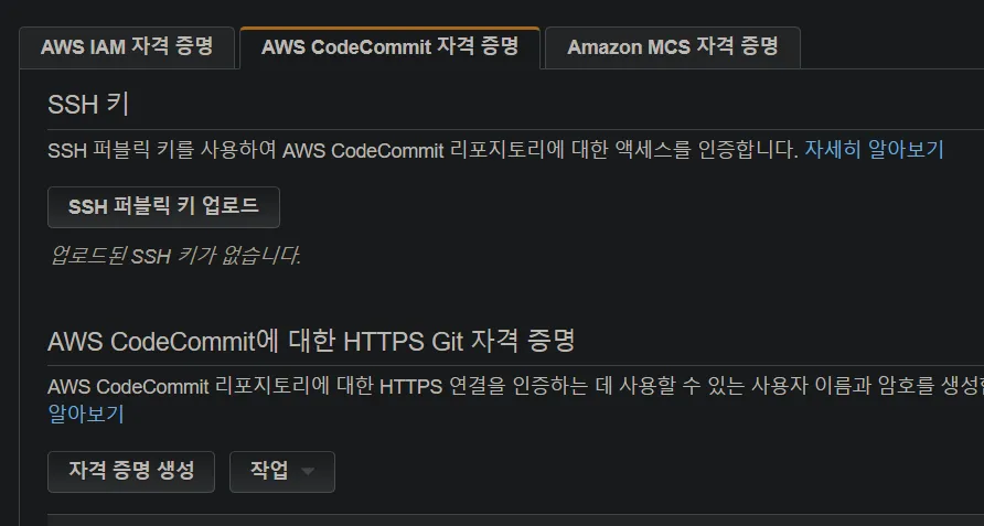 여기서 두번째 탭에 있는 AWS CodeCommit 자격 증명을 선택한다.