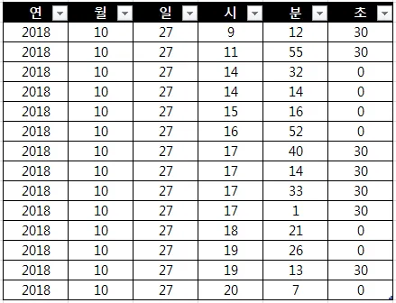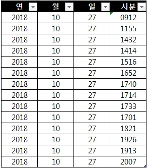 이런 테이블이 있다고 가정할 때, 시와 분을 합친 시분 컬럼이 필요할경우 ETL을 적용해 다음과 같은 테이블로 만들 수 있다.