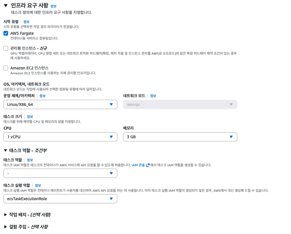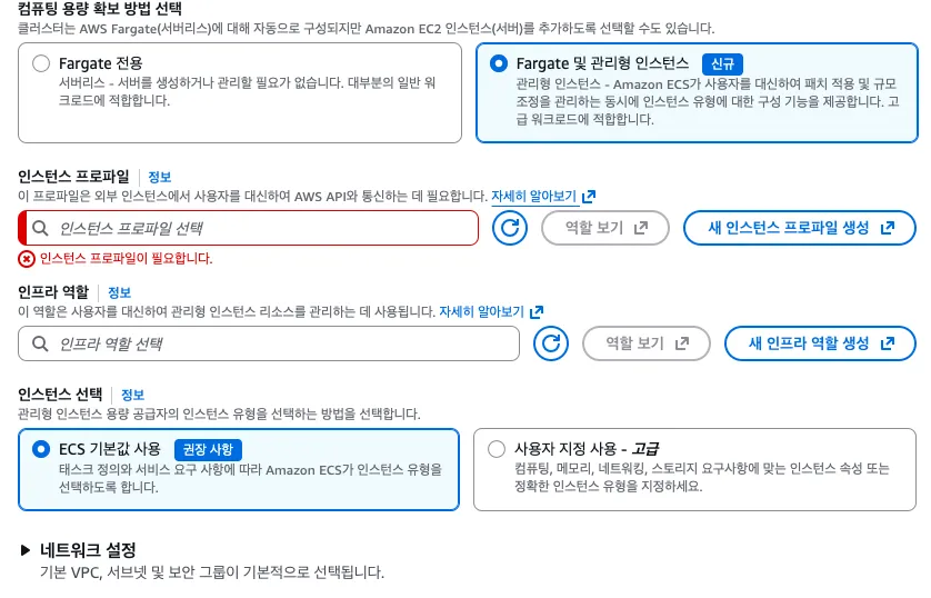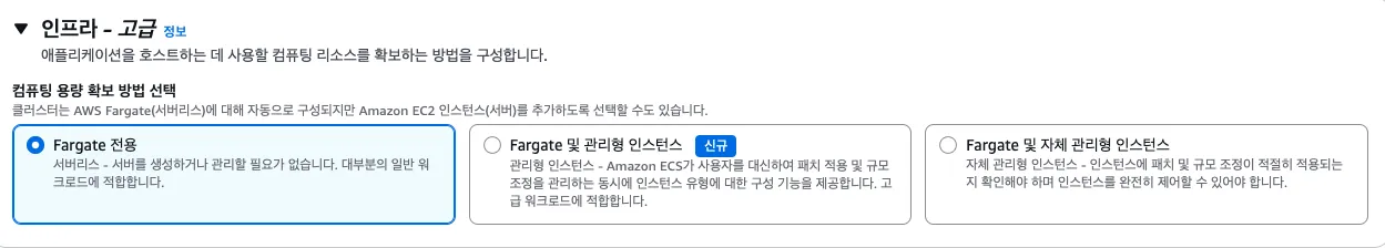 - 인프라 유형 선택 (Managed Instance / Fargate / Custom)
