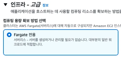 - 인프라 유형 선택 (Managed Instance / Fargate / Custom)