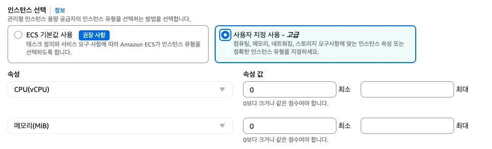 - ECS Managed Instance 선택 시: AWS가 자동 최적화