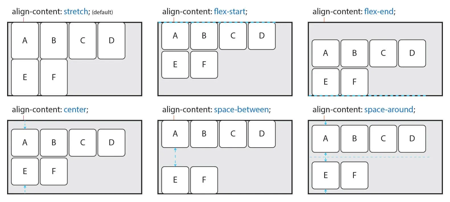 교차 축의 정렬 방법을 설정한다. flex-wrap : wrap 속성을 사용해 item이 여러 줄로 정렬되어있고 컨테이너에 여백이 있는 경우에만 사용할 수 있다.
