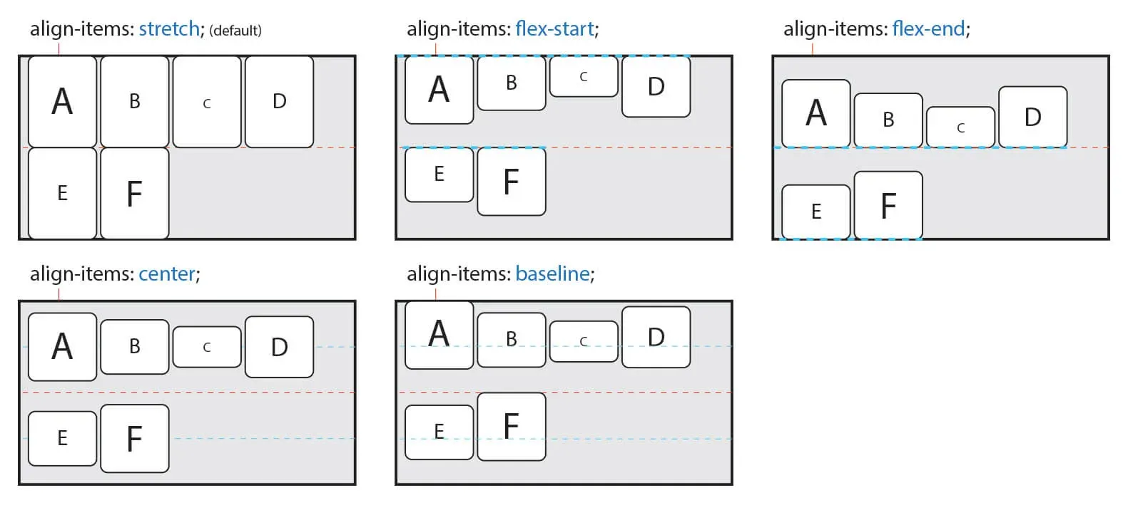 교차축의 item 정렬 방법을 설정한다. item이 여러 줄일 경우 align-content 속성이 우선하기 때문에 align-items를 사용하려면 align-content는 기본값이 되어있어야 한다.