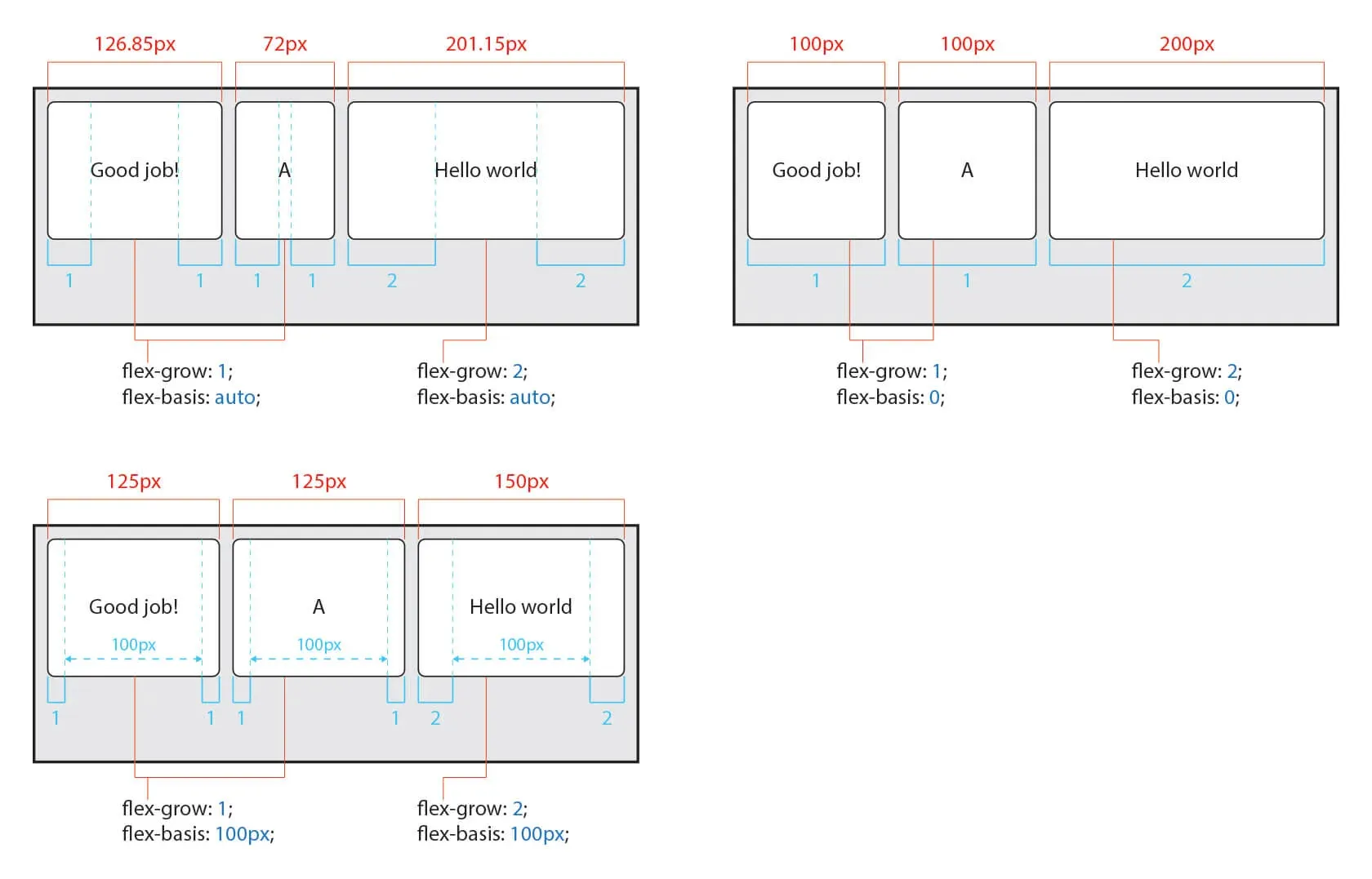 flex-grow: 증가 너비 비율 설정 (default 값은0)flex-shrink: 감소 너비 비율 설정flex-basis: item의 기본 너비 설정(auto)