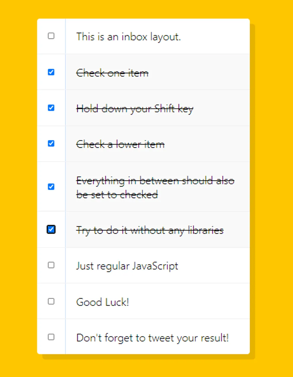 구현해야 하는 기능은 하나의 체크 박스를 선택하고 Shift 키를 누른 상태로 위/아래의 다른 체크 박스를 선택하면 그 사이에 있는 모든 체크 박스가 함께 선택되는 기능이다.