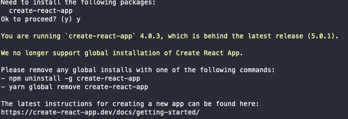 옛날에 create-react-app을 설치한 적이 있어서 생기는 오류인 것 같다. 현재 컴퓨터에 설치된 패키지가 없음에도 설치된 패키지를 삭제하라는 메세지가 출력됐다.