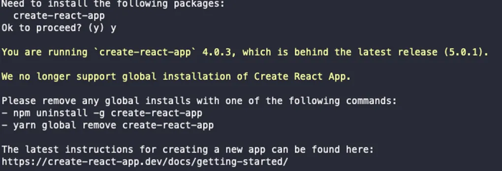 옛날에 create-react-app을 설치한 적이 있어서 생기는 오류인 것 같다. 현재 컴퓨터에 설치된 패키지가 없음에도 설치된 패키지를 삭제하라는 메세지가 출력됐다.