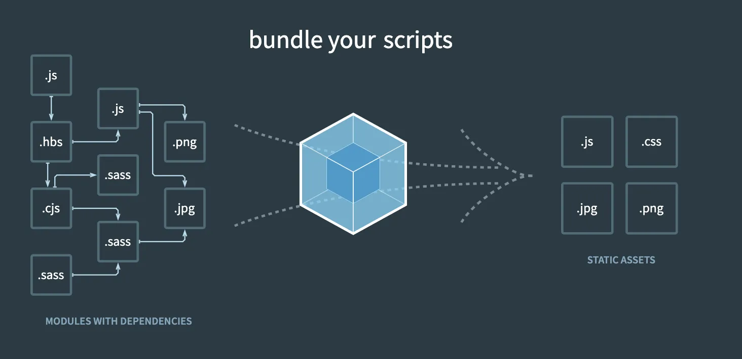 webpack은 Javascript용 static module bundler이다. 한 개 이상의 entry points를 통해 내부적으로 dependency graph를 만들어 모든 모듈을 번들링 시켜주어, 결과적으로 프로젝트에서는 한 개의 번들만 import 시키면 된다. 이게 webpack의 기본 concept이다. 번들러는 webpack말고도 Gulp등.. 다양하게 있지만 가장 많은 기능을 가지고 있는 툴은 webpack인 듯 하다.