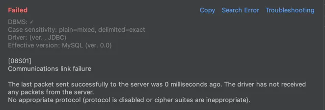 데이터 소스 리스트를 보면 MySQL이 보인다. 선택하고 DB 정보를 입력하고 Test Connection을 누르면 연결이 잘 되는지 확인할 수 있는데 계속 접속 에러가 났다.