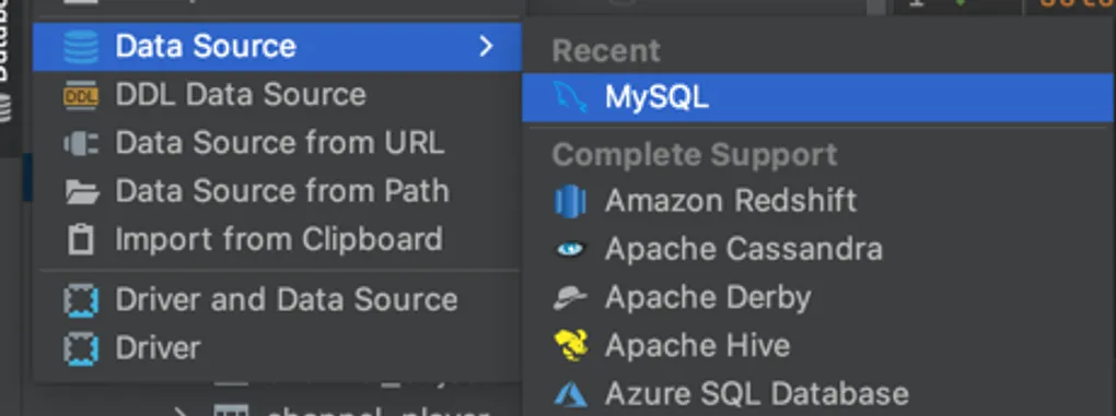 데이터 소스 리스트를 보면 MySQL이 보인다. 선택하고 DB 정보를 입력하고 Test Connection을 누르면 연결이 잘 되는지 확인할 수 있는데 계속 접속 에러가 났다.