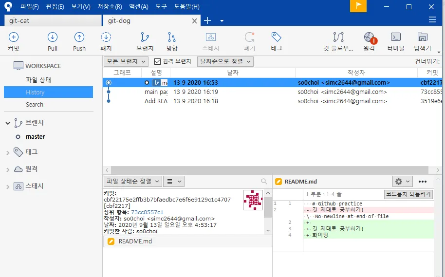 탭 이동을 한 번 해야 log를 확인할 수 있었던 Git Desktop과 달리 한 눈에 commit log를 확인할 수 있었다.