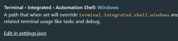vs code의 설정으로 들어가 Terminal > Integrated > Automation Shell:Windows를 찾아 settings.json으로 들어간다.