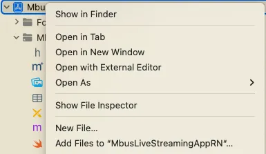 xcode를 실행하고 왼쪽 상단의 프로젝트명을 오른쪽 클릭하여 Add Files to "project_name"을 클릭한다.
