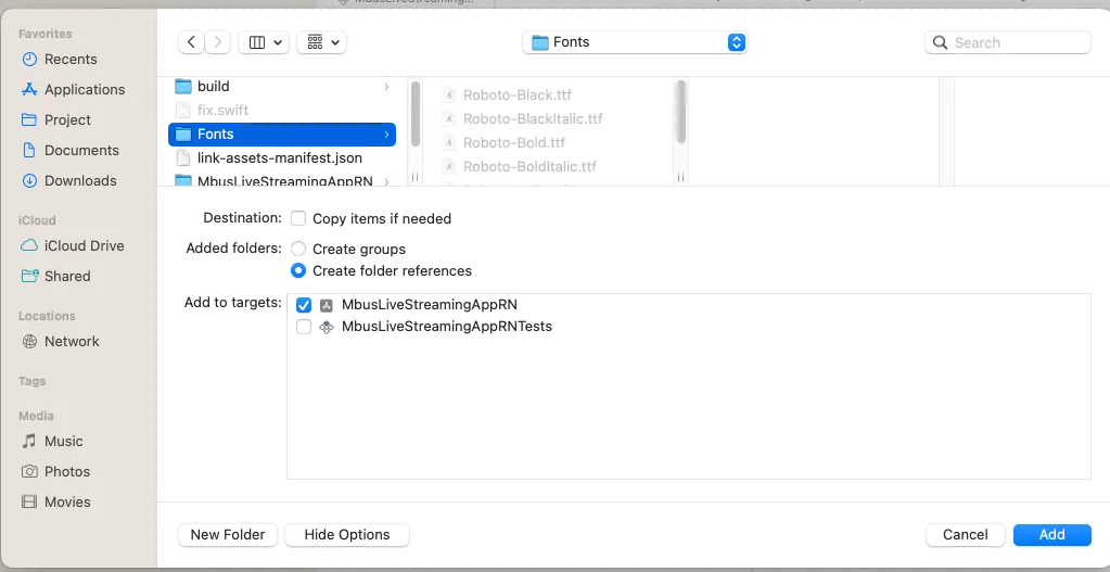 방금 생성한 ios/Fonts를 선택하고 아래와 같은 옵션으로 Add 버튼을 누른다.