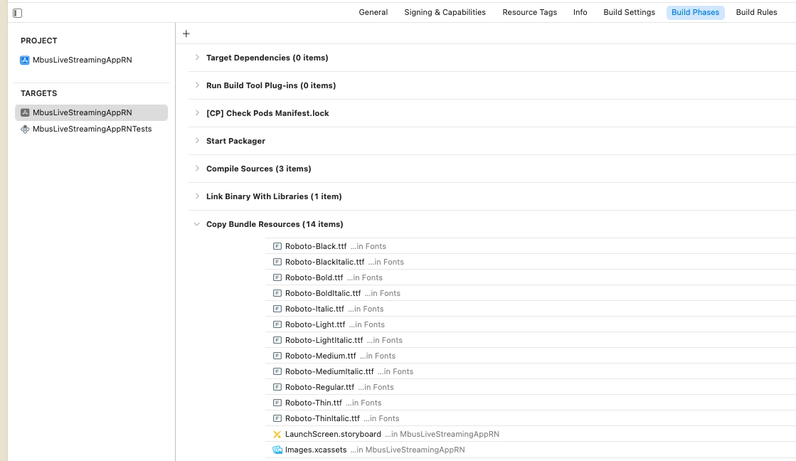 그래서 구글링을 하여 추가로 진행한 작업이 Build Phases의 Copy Bundle Resources에 폰트 파일을 추가하는 것이다.